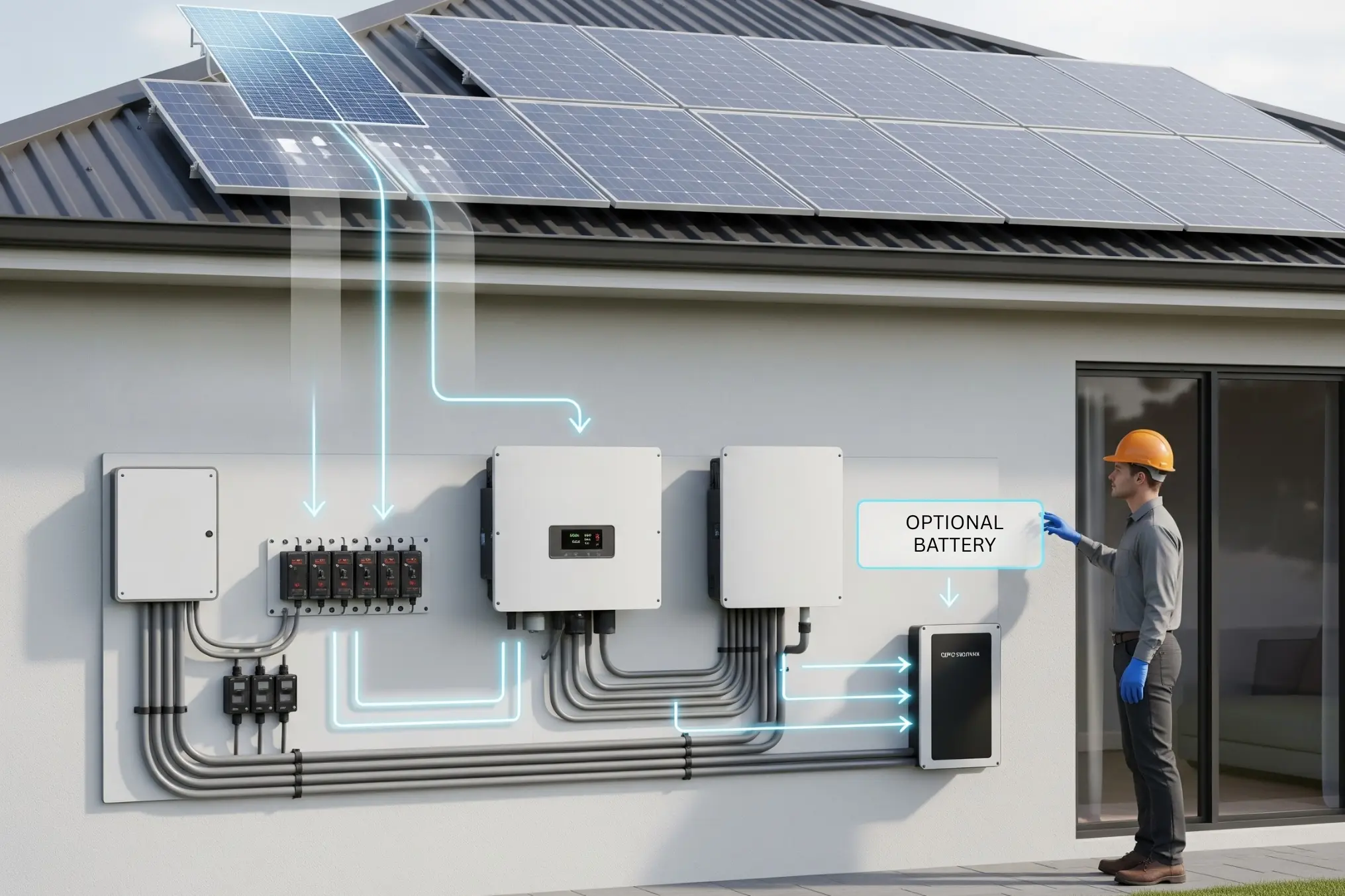 The 13.2 kW system uses premium, high-output solar modules to maximize power generation throughout the day. A high-efficiency inverter converts this power into usable electricity for your home. During sunlight hours, your home will be powered primarily through solar. With an optional battery, excess energy can be stored and used at night, significantly reducing grid reliance.